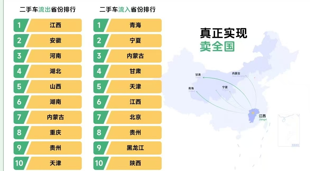 与此同期,二手车跨省运动已成常态,2025年10月,世界转籍比例达到33.1%的历史高位。而在瓜子平台上,仅跨省运动的比例就已是世界转籍率的两倍多,跨城市运动比例更是接近九成。瓜子二手车平台数据表示,江西成为二手车流出最多的省份,近九成车源销往省外;而细化到城市维度,平台上有跳跃60个城市的二手车供给100%流出,在区域外达成交往。而青海、宁夏、甘肃、内蒙古等省份,则成为错误的车泉源入地。