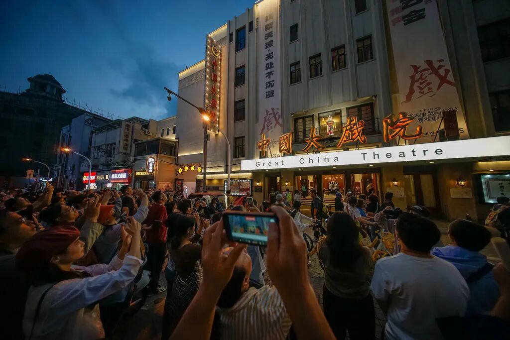 2025年10月3日,天津中国大戏院开放尘封多年的二楼阳台推出京剧快闪《霸王别姬》,劝诱国庆长假中的市民和旅客围不雅。视觉中国丨图